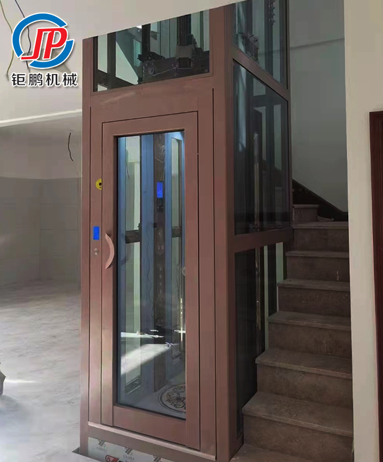 鉅鵬家用電梯以液壓泵站為動力,輸入380V或220v電源,電機轉動帶動油泵,將液壓油注入油缸,開始舉升平臺提升至預定位置,設有行程開關,自動停止。下降時,按下降按鈕設備自動下降,配電箱內設有電機延時保護。